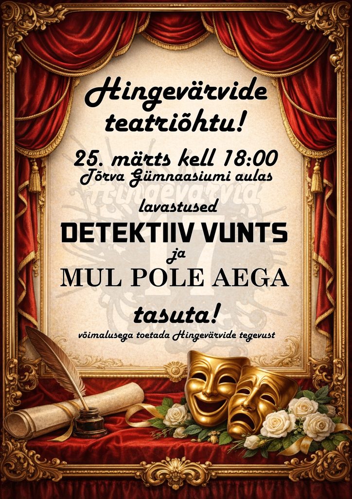 Kell 18.00 esietendub vahva lugu “Detektiiv Vunts” kus seni tuntud muinasjutud pööratakse peapeale ja lood saavad hoopis teise vaatenurga. “Detektiiv Vuntsi” seiklused toob teieni meie algklasside trupp. Umbes kell 18.20 esietendub lavastus “Mul pole aega”, milles vaatame lähemalt sisse ajale, kuidas me aega kasutame ja miks me kogu aeg ütleme, et meil ei ole aega. Ajast aitavad laval lugusid luua meie gümnaasiumi trupi näitlejad.