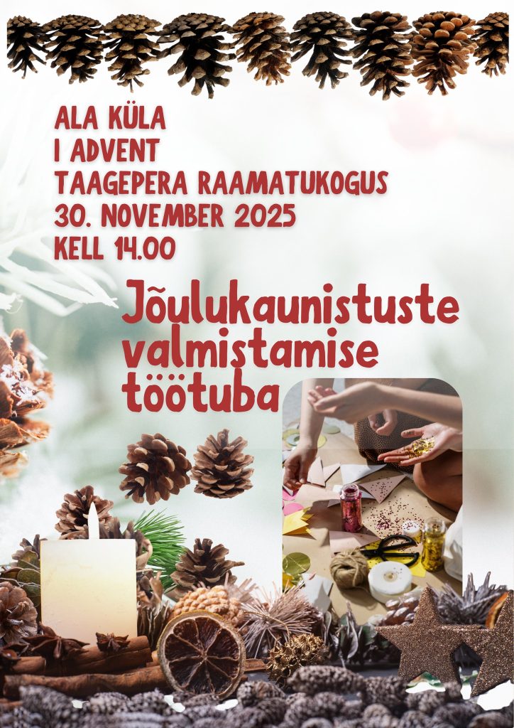 Juba 30. novembril kell 14.00 ootame kõiki Taagepera raamatukokku, et ühiselt meisterdada jõulukaunistusi, ajada juttu ja tunda üksteisest rõõmu. Töötuba on kõigile tasuta. Peale kaunistuste tegemist süütame ühiselt õues jõulutuled.
