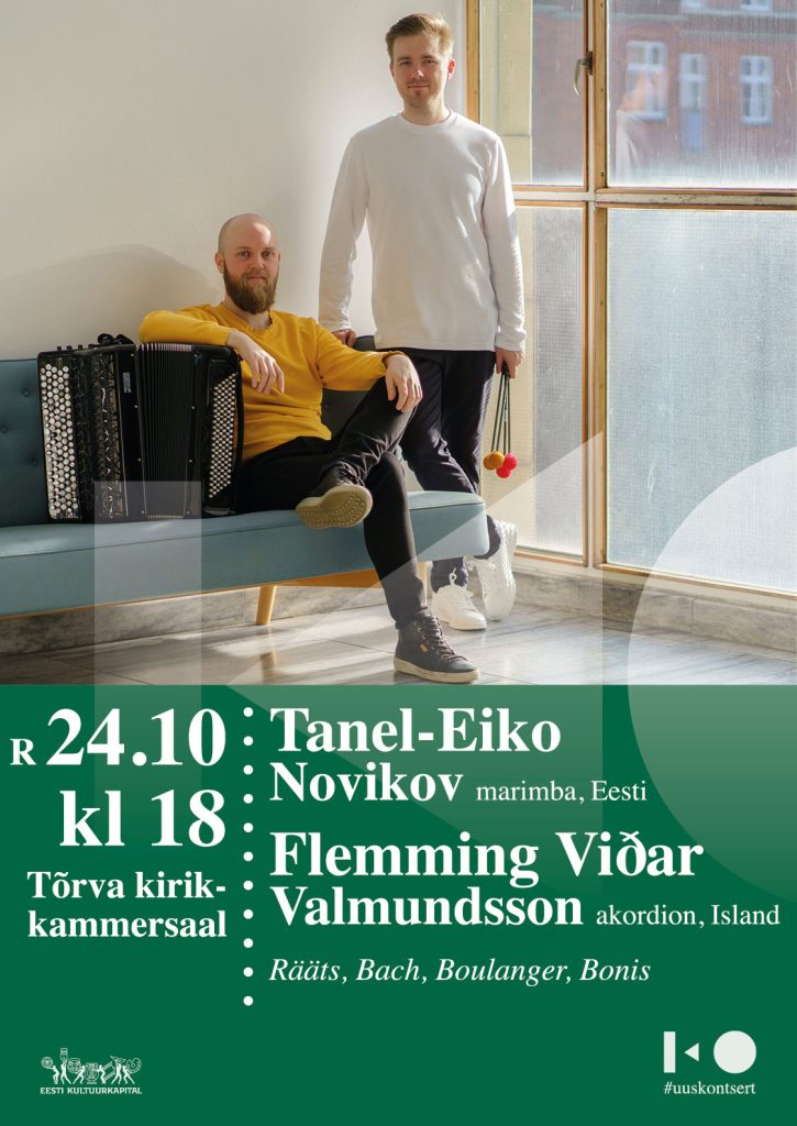 24. oktoobril toimub Tõrva Kirik-Kammersaalis Tanel-Eiko Novikovi ja Flemming Viðar Valmundssoni kontsert. Täispilet 20€ ja sooduspilet 15€.