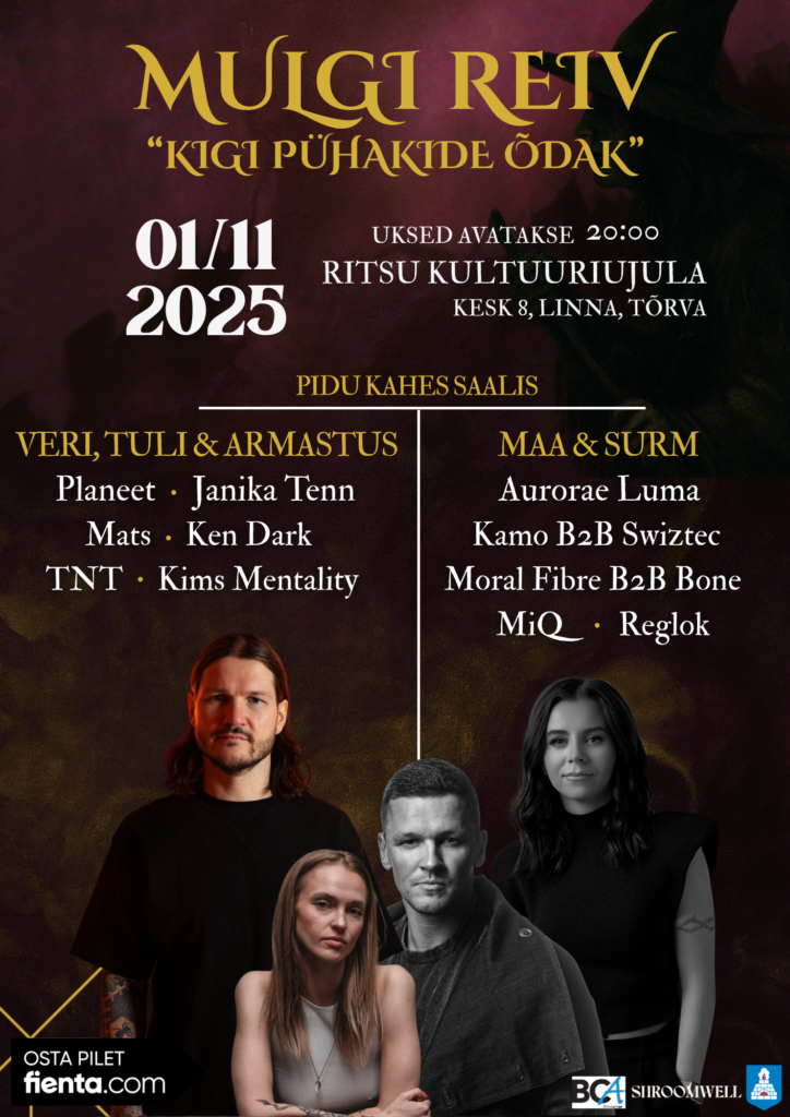 Tule ja sukeldu maailma, mis on veidi teistsugune, aga südamega loodud. Mulgi Reiv ei ole lihtsalt pidu ega tavaline Halloween – see on maagiline öö, mida sa lihtsalt ei tohi maha magada. Sellel ööl põimuvad elektrooniline ja elav muusika, valgus, kunst ning Mulgi folkloor üheks maagiliseks rännakuks.