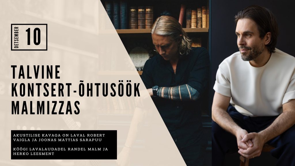 Laua broneerimine ja piletid: Kontsert-õhtusöögi hind ühele inimesele on 60 €. Piletid saadaval Malmizzas kohapeal või malmizza.ee (broneeri laud 10. detsembriks kella 19.00ks ning Sind suunatakse kohe edasi kohtade eest tasuma).