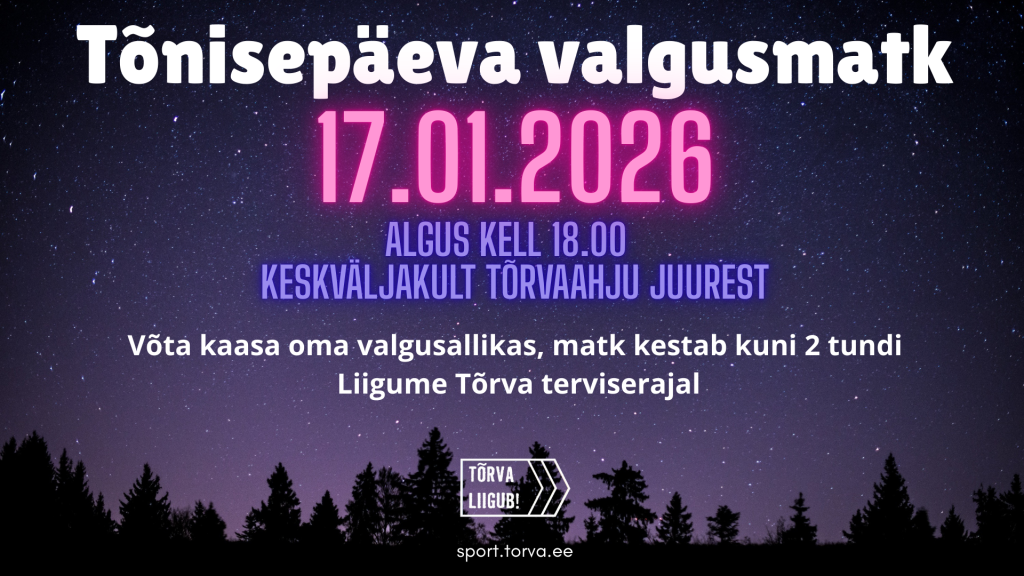 Tõnisepäeva valgusmatk toimub 17. jaanuaril algusega kell 18.00 Tõrva ahju juurest. Liigume terviserajal, mis pole valgustatud, seega matkale tulles kaasa võtta oma valgusallikas. Matka kestvus umbes 2 tundi.