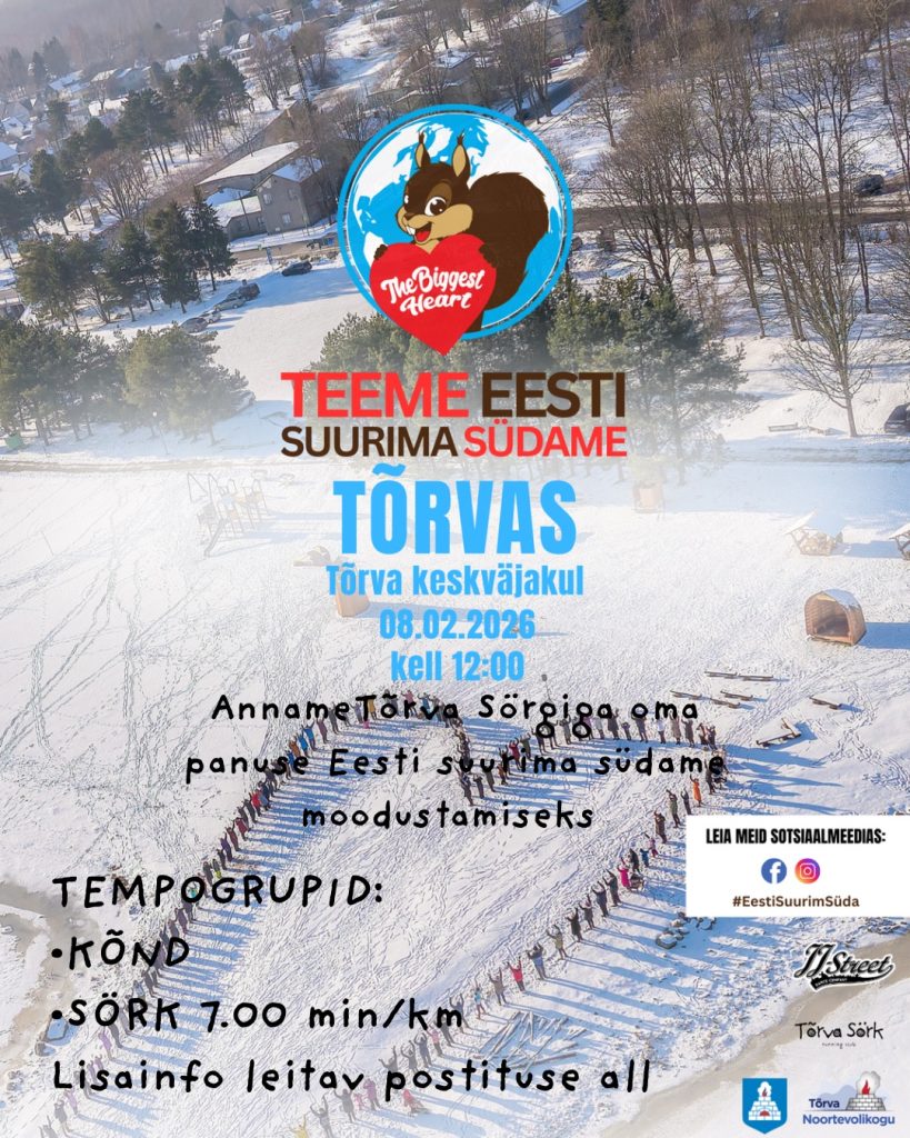 Juba 8. veebruaril kell 12:00 ootame Teid kõiki Tõrva keskväljakule, et moodustada ühiselt suur südame kuju ning jäädvustada see drooniga pildile. Peale südamepildi tegemist toimub Tõrva sörgi etapp, kus igaüks leiab endale sobiva tempo – saab kõndida, sörkida või joosta. Keegi ei jää maha!
